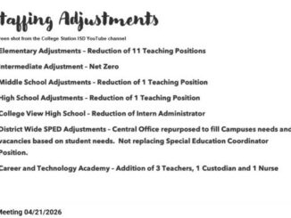 April’s meeting of the College Station ISD school board included two presentations related to developing the budget for the 2026-2027 school year. The first presentation [Read More...] -
