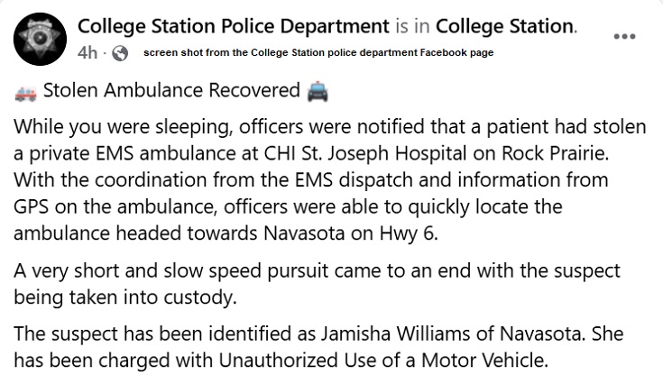 That led to the arrest of a woman who had been released from the hospital earlier in the night, 37 year old Jamisha Williams of Navasota, for unauthorized use of a motor vehicle.