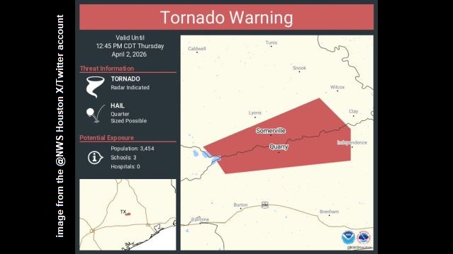 Thursday during the noon hour, the National Weather Service issued a tornado warning on both sides of Yegua Creek in Burleson and Washington counties. There were two posts on the Burleson County sheriff’s Facebook page, one who wrote seeing a touchdown in a field and another saying they saw the funnel over the dam at Lake Somerville.