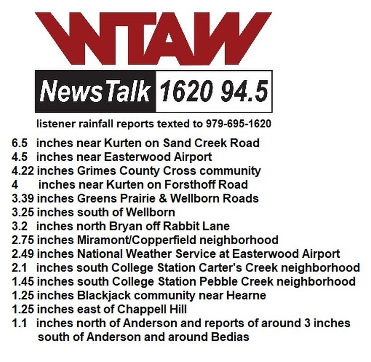 Texts from WTAW listeners ranged from 1.1 inches north of Anderson to 6.5 inches near Kurten on Sand Creek Road.