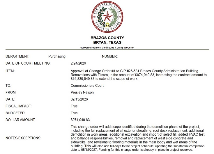 Brazos County commissioners add $975,000 dollars to the $15 million dollar renovation of the administration building.
