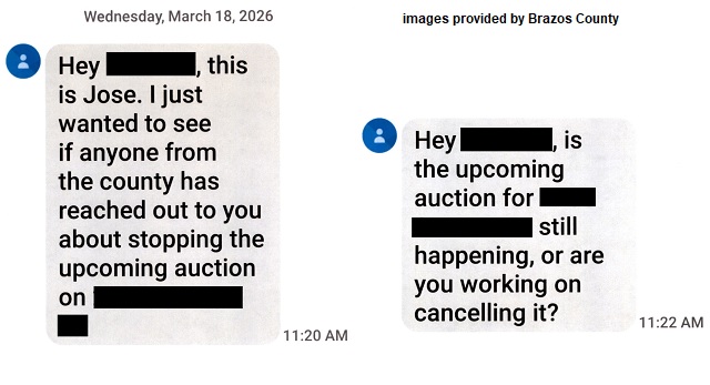 Brazos County Tax Assessor/Collector Melissa Leonard says the tax office has received numerous calls this morning from concerned tax payers who have received text messages stating they owe back taxes and their homes are up for auction.