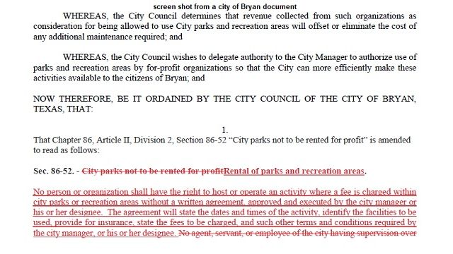 The Bryan city council approves changing the city ordinance regulating park operations that will now allow for-profit organizations to stage events with permission.