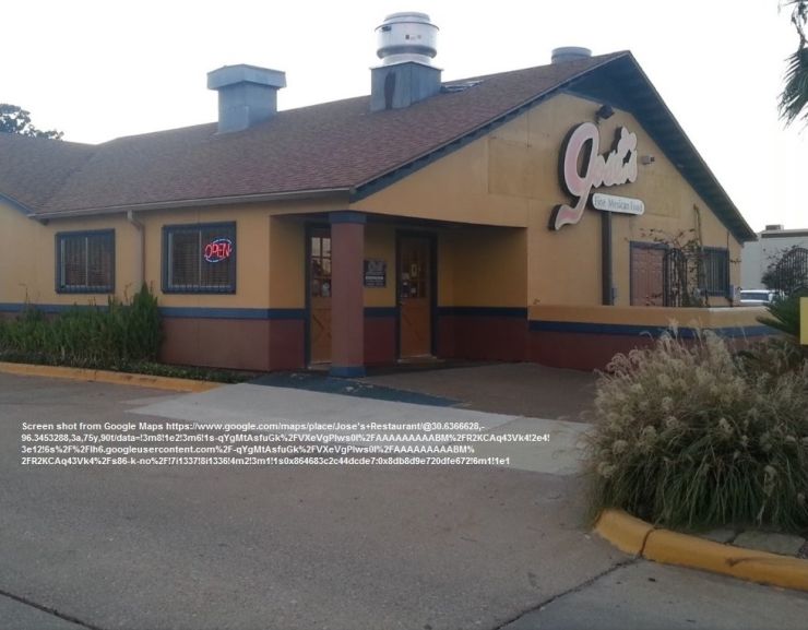 Screen shot from Google Maps: https://www.google.com/maps/place/Jose’s+Restaurant/@30.6366628,-96.3453288,3a,75y,90t/data=!3m8!1e2!3m6!1s-qYgMtAsfuGk%2FVXeVgPlws0I%2FAAAAAAAAABM%2FR2KCAq43Vk4!2e4!3e12!6s%2F%2Flh6.googleusercontent.com%2F-qYgMtAsfuGk%2FVXeVgPlws0I%2FAAAAAAAAABM%2FR2KCAq43Vk4%2Fs86-k-no%2F!7i1337!8i1336!4m2!3m1!1s0x864683c2c44dcde7:0x8db8d9e720dfe672!6m1!1e1