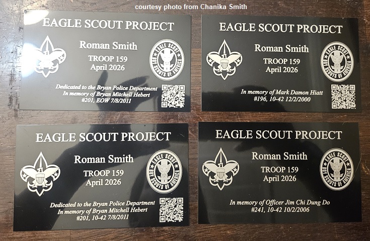 Additionally, Smith and fellow members of Boy Scout troop 159 at the Bryan American Legion have built benches to be used by officers training at the local law enforcement academy next to Twin Oaks Landfill.