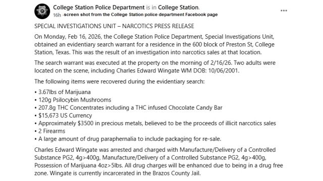 A CSPD Facebook post says the drugs that were collected were 3.67 pounds of marijuana, 207.8 grams of THC concentrates, 120 grams of psilocybin mushrooms, and a large amount of drug paraphernalia including packaging for re-sale. The street value of the drugs was not disclosed.