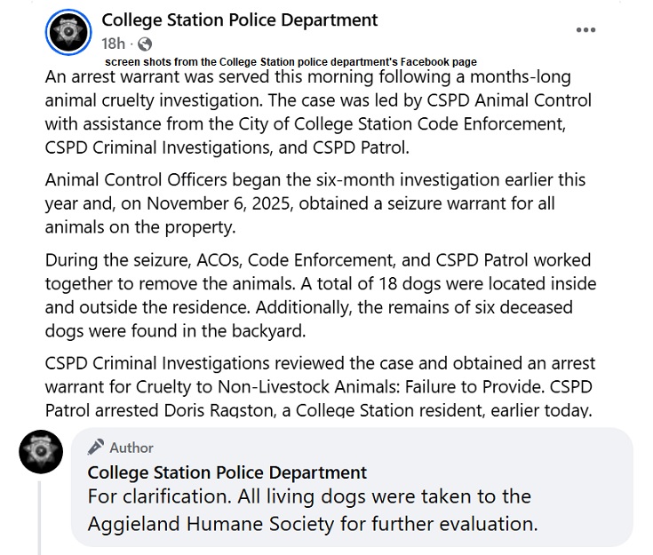 All living dogs were taken to the Aggieland Humane Society for further evaluation.