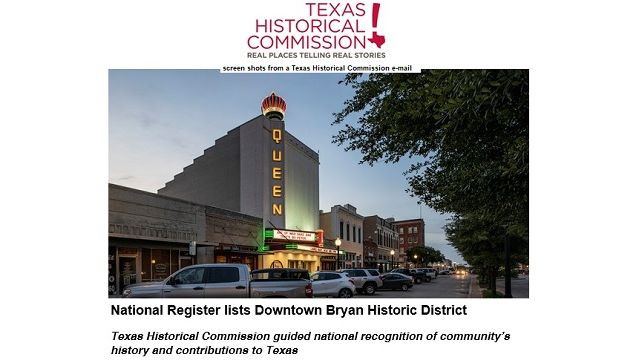 The Downtown Bryan Historic District in Brazos County was recently listed in the National Register of Historic Places with the assistance of the Texas Historical Commission (THC).