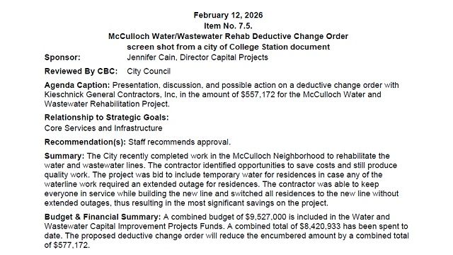 The replacement of water and wastewater lines in a College Station residential neighborhood was completed at a savings of more than $577,000 dollars.