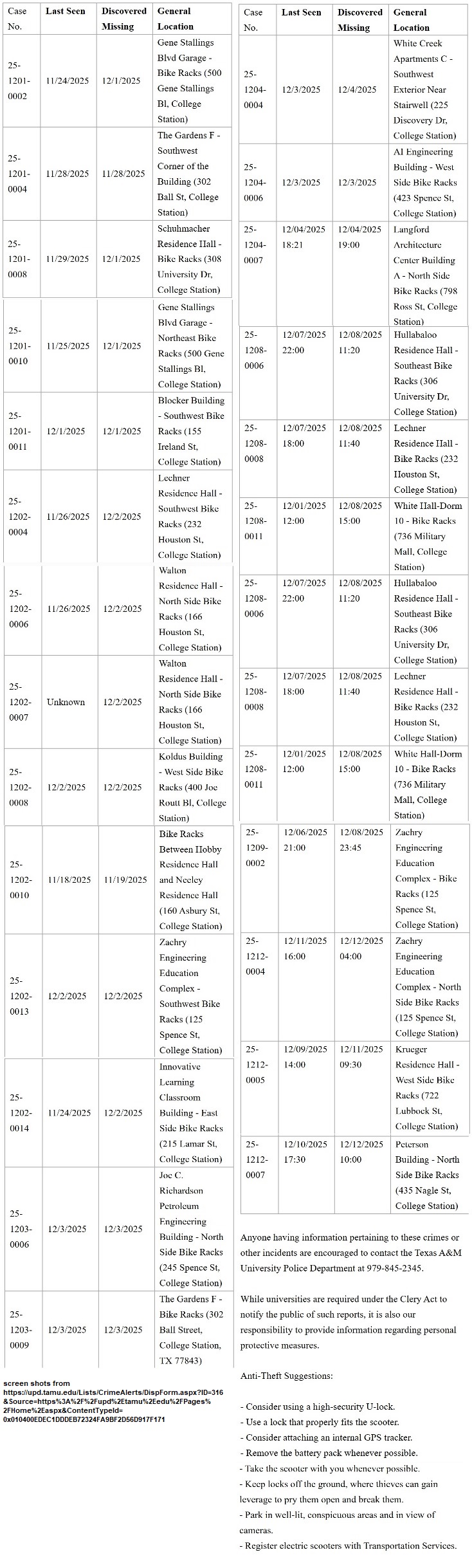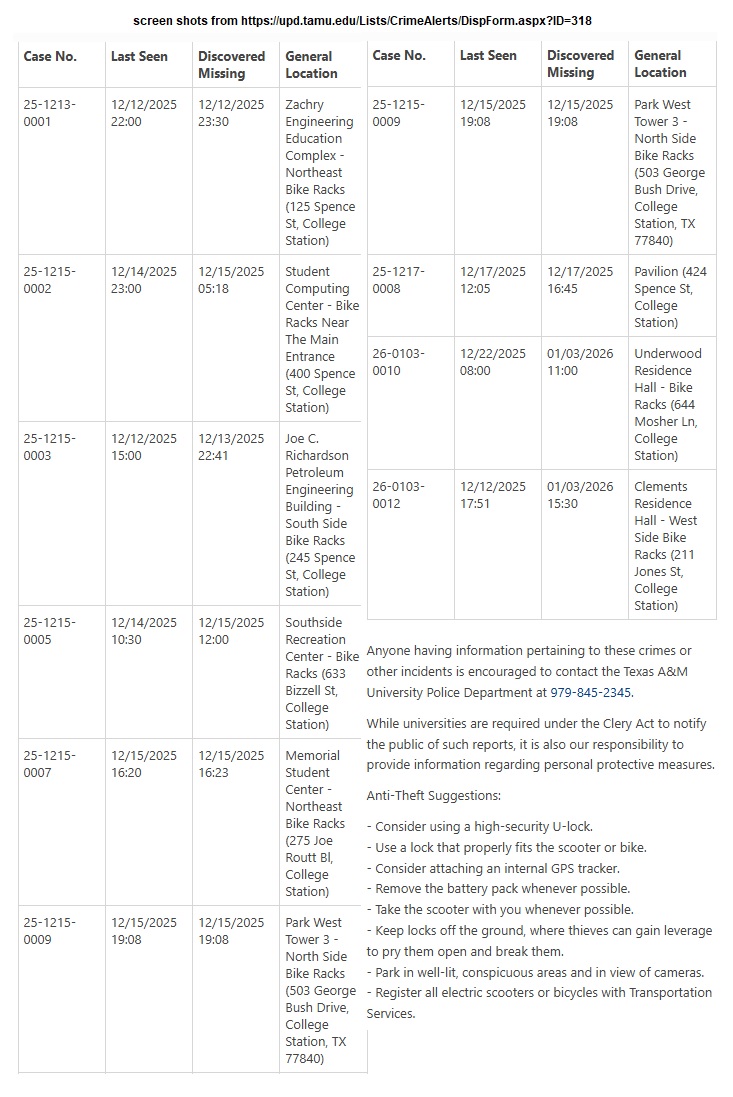 WTAW News previously reported 59 thefts of electric scooters and bicycles during a nine week period between the week before last Thanksgiving and January 13th.