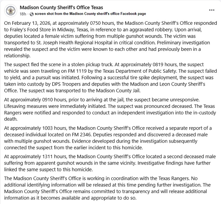 Madison County sheriff’s office edited post on their Facebook page on February 13, 2026: