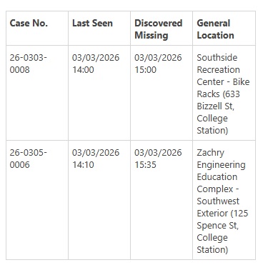 Screen shots of reported thefts of electric scooters and bicycles that were posted on the Texas A&M police website between February 16 and April 1, 2026: