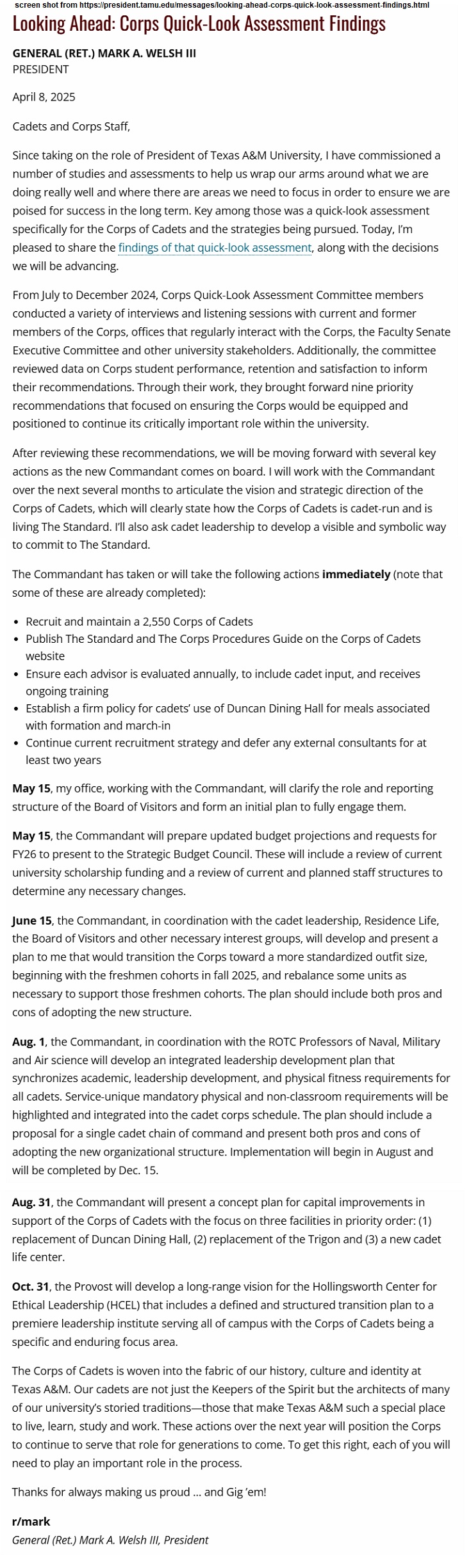 Texas A&M’s president provides an update on his assessment of the Corps of Cadets.