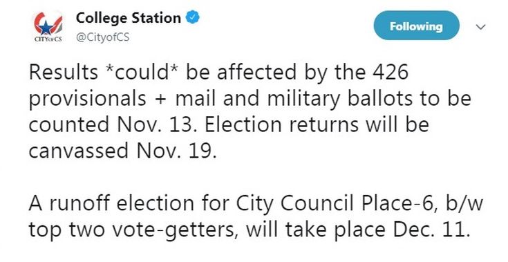 According to College Station city secretary Tanya Smith, there are 426 provisional ballots and a yet to be determined number of mail and military ballots that could arrive.